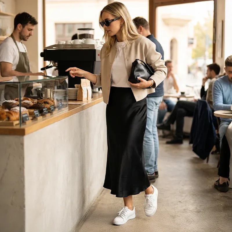 Step into timeless style with a skirt that offers both chic appeal and all-day comfort. The high-waisted design elongates the legs, providing a slimming effect. Crafted from satin, the skirt catches the light beautifully and creates a stunning flow as you move. Its midi length makes it the perfect companion for day-to-night transitions. Whether paired with a fitted top or a flowing blouse, this skirt effortlessly adapts to your personal style.