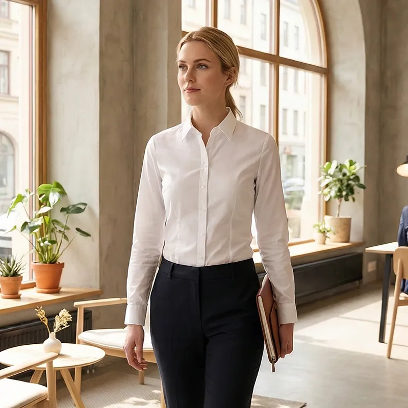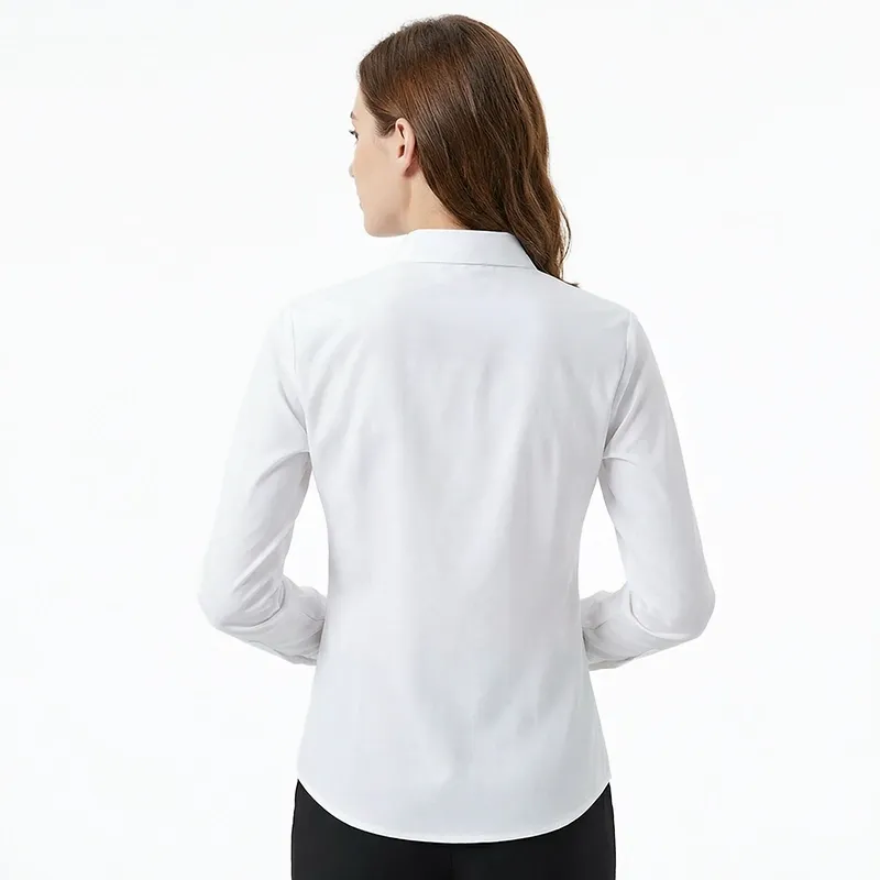 Elevate your look with this tailored white blouse, offering a sleek silhouette. The soft fabric feels gentle against the skin, ensuring comfort during extended wear. Its classic design pairs effortlessly with skirts, trousers, or under a suit jacket. The long sleeves provide appropriate coverage, suitable for formal office environments. Durable stitching ensures longevity, maintaining its form through regular use.
